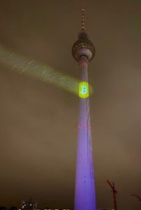 O logotipo do Bitcoin iluminou a torre Berliner Fernsehturm, conhecida como Torre de TV. Os bitcoiners alemães acessaram o Twitter e as mídias sociais para compartilhar fotos e vídeos da iluminação, depois compartilhados por contas proeminentes do Bitcoin.