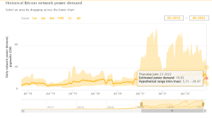 A rede Bitcoin registrou a menor demanda de energia do ano de 2022 de 10,65 gigawatts (GW) em 25 de junho. Como resultado, o poder de computação para mineração de blocos BTC caiu para 199,225 exahash por segundo (EH/s).