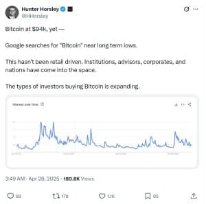 Ressoando a perspectiva de Chung, Hunter Horsley, CEO da empresa de gestão de criptoativos Bitwise, também comentou sobre a atual alta do Bitcoin. Em uma publicação recente no X (antigo Twitter), ele observou que a recente alta do Bitcoin para US$94.000 ocorreu com relativamente pouco envolvimento do varejo.