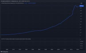 (M2 oferta de moeda 1969–2024, uma medida da quantidade total de USD em circulação.)