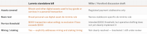 Em 2025, Lummis apresentou um projeto que previa isenção para transações de até US$ 300, com limite anual de US$ 5 mil. A proposta, no entanto, não avançou no Senado. Paralelamente, surgiu uma iniciativa concorrente focada exclusivamente em stablecoins, apresentada pelos deputados Max Miller e Steven Horsford.