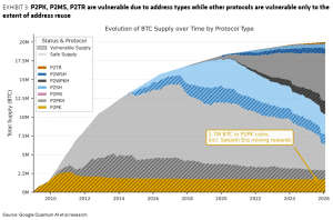 Ainda assim, alguns tipos de endereços são apontados como mais sensíveis ao risco. Modelos como P2PK, P2MS e P2TR apresentam maior exposição potencial, especialmente quando associados a carteiras antigas. Estima-se que cerca de 1,7 milhão de bitcoins estejam nesses formatos, incluindo aproximadamente 1,1 milhão ligados a Satoshi Nakamoto. Uma parcela relevante da rede carrega vulnerabilidades históricas.