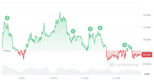 Desde que atingiu a mínima anual de US$ 60 mil em fevereiro, o Bitcoin tem operado entre aproximadamente US$ 60 mil e US$ 74 mil. No momento, gira em torno de US$ 66 mil, acumulando queda superior a 8% no último mês, segundo dados da COINMARKETCAP. O preço está preso em uma zona de indecisão.
