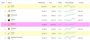 O Bitcoin ultrapassou recentemente a Amazon e se tornou o 5º maior ativo do mundo em valor de mercado, atingindo uma capitalização de mercado de aproximadamente US$2,4 trilhões.