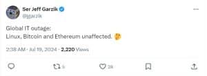 O ex-desenvolvedor do Bitcoin Core e do Linux, Jeff Garzik, observou o contraste entre as interrupções generalizadas nos serviços centralizados enquanto os blockchains continuam funcionando sem problemas. Em uma postagem na plataforma de mídia social X (Twitter), ele declarou “Interrupção global de TI: Linux, Bitcoin e Ethereum não afetados”.