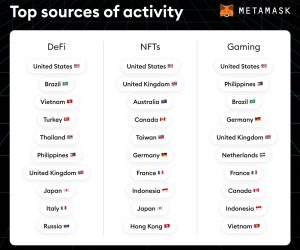 Apenas os EUA estão na frente do Brasil em número de protocolos DeFi. No que se refere aos usuários de games, EUA e Filipinas estão à frente do Brasil. O único setor atendido pelos serviços da MetaMask no qual o Brasil não figura no Top 10 do ranking é o de NFTs, que também é liderado por usuários norte-americanos, seguidos por britânicos e australianos.