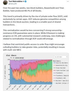 Suas preocupações sobre a centralização da produção de blocos surgem depois que o pesquisador da Ethereum Foundation, Toni Wahrstätter, apontou recentemente que dois construtores de blocos Ethereum — Beaverbuild e Titan Builder — construíram 88,7% de todos os blocos nas duas primeiras semanas de outubro.