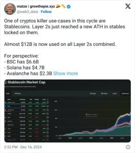 A integração de stablecoins nas redes de camada 2 da Ethereum foi um desenvolvimento fundamental. Em 20 de dezembro de 2024, essas redes coletivamente detinham mais de US$13,5 bilhões em stablecoins, marcando um novo recorde histórico.