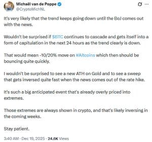 O estado psicológico do mercado atingiu um ponto de exaustão extrema, com o Índice de Medo e Ganância registrando consistentemente leituras abaixo de 20 ao longo de dezembro. Atualmente, as plataformas de mídia social são dominadas por narrativas pessimistas, que empresas de análise como a SANTIMENT frequentemente interpretam como um sinal contrário à tendência. Quando os investidores de varejo estão mais pessimistas e começam a questionar a viabilidade do ciclo a longo prazo, isso geralmente indica a formação de um fundo local. No entanto, alguns analistas acreditam que o mercado ainda não está suficientemente assustado para declarar um fundo verdadeiro, sugerindo que o Bitcoin pode precisar recuar ainda mais em direção à marca de US$ 75.000 ou até mesmo US$ 70.000 antes que uma recuperação genuína possa começar. Atualmente, as plataformas de mídia social são dominadas por narrativas pessimistas, que empresas de análise frequentemente interpretam como um sinal contrário à tendência.