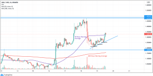O gráfico de 1 hora de Cardano mostra que o ativo atingiu baixas mais altas desde sua correção, montando uma linha de tendência de alta. O preço atualmente parece ter invertido a média móvel de 50 períodos, ou MA, para apoiar; seu preço atualmente está próximo a US$1,32. Em seu recente movimento de queda, o ADA não caiu o suficiente para atingir seu MA de 200 períodos.