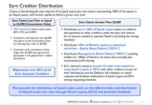 Estima-se que a opção fornecerá a mais de 85% dos clientes Celsius uma recuperação de cerca de 70% de suas criptomoedas depositadas. Qualquer credor do Earn com um saldo superior a US$5.000 pode optar por reduzir uma reivindicação para US$5.000 e participar.