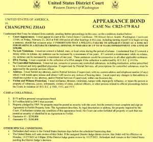 Em um documento de fiança apresentado em um tribunal federal de Seattle, Zhao concordou em compartilhar com o tribunal onde ele residiria e que um mandado de prisão poderia ser emitido se ele não comparecesse à data do julgamento.