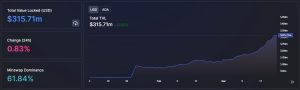 A plataforma de análise de finanças descentralizadas (DeFi) DefiLlama rastreia apenas 7 DApps em execução no Cardano e um total de US$315,72 milhões em valor total bloqueado (TVL), excluindo tokens de governança em jogo. Dois desses DApps têm $0 TVL fora dos tokens de governança.