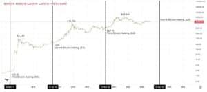 Os halvings do Bitcoin geralmente impactam significativamente o preço do BTC, com os mercados de alta historicamente atingindo o pico de 518 a 546 dias após os eventos de halving.