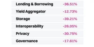 Apesar de uma alta no final do terceiro trimestre, 16 setores ainda sofreram perdas de pelo menos 10% no valor de mercado no terceiro trimestre, caindo até 40%. De acordo com a CMC, os setores de armazenamento, empréstimos e privacidade da indústria foram os que mais lutaram, vendo perdas de 39%, 37% e 31%, respectivamente.