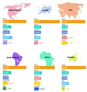 Ether (ETH), a segunda maior criptomoeda por capitalização de mercado, ficou em terceiro lugar na maioria das regiões, com uma participação média de mercado de aproximadamente 13%.