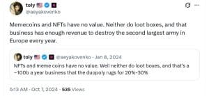 “Eu digo isso há anos. Memecoins e NFTs são lixo digital e não têm valor intrínseco.”