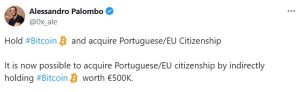 Num post, Alessandro Palombo, cofundador e CEO do Unbound Fund, anunciou a possibilidade de obter a cidadania portuguesa investindo em Bitcoin (BTC).