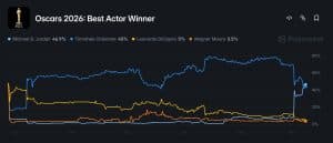 Nos dados mais recentes da POLYMARKET, os participantes do mercado atribuem cerca de 47% de probabilidade de vitória a Jordan. Chalamet aparece logo atrás com aproximadamente 45%. A disputa permanece extremamente apertada.