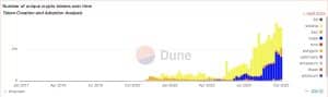 No entanto, essa concentração de capital no topo do mercado é impulsionada por um problema estrutural mais profundo: uma superoferta massiva de novos tokens. A barreira de entrada para a criação de uma nova criptomoeda praticamente desapareceu. Ferramentas automatizadas e plataformas de lançamento de moedas de memes tornaram possível implantar um novo ativo em segundos por centavos. O resultado é um mercado inundado de oferta. Dados da DUNE ANALYTICS e do COINMARKETCAP revelam que existem agora mais de 26 milhões de tokens criptográficos diferentes, um número que mais que dobrou desde o início de 2025.