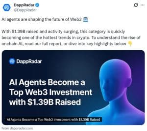 De acordo com um relatório recente da empresa de análise de blockchain DappRadar, os aplicativos descentralizados (DApps) relacionados à IA agora representam uma parcela significativa do uso de blockchain, perdendo apenas para os jogos.