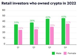 Embora a adoção de criptomoedas entre as mulheres tenha decolado no último trimestre de 2022, a propriedade entre os homens aumentou apenas um por cento no mesmo período.