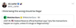 O comentário, que ecoa alegações infundadas de outros céticos de criptomoedas no governo no passado, não foi bem recebido.