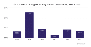 Um relatório da empresa de dados de blockchain, Chainalysis, descobriu que apenas 0,34% de todas as transações de criptomoedas em 2023 poderiam estar vinculadas a qualquer tipo de atividade ilegal.