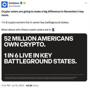 Um estudo da Coinbase revelou que os eleitores de criptomoedas, em particular, farão uma grande diferença nas principais disputas, com 1 em cada 6 proprietários de criptomoedas vivendo nos sete principais estados de batalha.