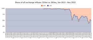 (Influxos cambiais de CEXs comparados a DEXes entre 2013 a 2022. Fonte: Chainalysis)