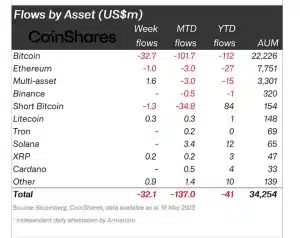 De acordo com a última edição da CoinShares de seu “Relatório de Fluxos de Fundos de Ativos Digitais”, publicado em 22 de maio, as saídas de fundos criptográficos totalizaram US$ 32 milhões entre 15 e 19 de maio, marcando a quinta semana de saídas consecutivas.