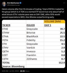 Os fluxos totais para os 9 veículos de investimento Ether (ETH) atingiram US$112 milhões nos primeiros 15 minutos de negociação, o que é muito mais do que as ofertas tradicionais de ETF, afirmou o analista da Bloomberg.