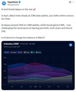 O relatório do setor de abril de 2025 destaca que, enquanto jogos e DeFi mantêm uma participação de mercado de 21% cada, os DApps de IA subiram para 16% — um aumento notável em relação aos 11% relatados em fevereiro de 2025.