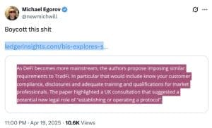“Qual a relevância das preocupações do BIS sobre o anonimato dos desenvolvedores de DeFi? As instituições financeiras tradicionais raramente publicam listas de seus próprios desenvolvedores. Desculpe, mas quando foi a última vez que uma empresa de TradFi publicou uma lista de seus desenvolvedores? As empresas de capital aberto oferecem um certo grau de divulgação e transparência, mas parecem estar desaparecendo em favor dos mercados privados.”