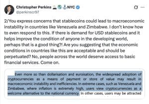 Perkins também criticou a preocupação sobre o potencial das stablecoins causarem instabilidade macroeconômica em países como Venezuela e Zimbábue. Embora reconhecendo as complexidades que cercam as stablecoins, se as stablecoins lastreadas em dólares americanos ajudam a melhorar as condições financeiras das pessoas em países em desenvolvimento, isso deve ser visto como um desenvolvimento positivo.