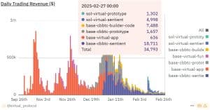 A receita do protocolo de seu aplicativo virtual no Base, o blockchain de camada 2 do Ethereum, tem sido particularmente baixa. Os ganhos na Base permaneceram abaixo de US$1.000 por 10 dias consecutivos, marcando um declínio acentuado de uma alta de US$859.000 em ganhos diários em outubro de 2024. Em fevereiro, a Virtuals havia gerado apenas US$28.492 na Base e US$6.300 na Solana. Essa redução drástica nos ganhos levantou questões sobre a viabilidade futura da plataforma e a sustentabilidade a longo prazo.