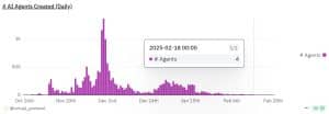 Além de sua receita em declínio, o Virtuals Protocol também está lutando com baixa atividade em termos de novos agentes de IA sendo criados. Nos últimos 10 dias, menos de 10 novos agentes de IA foram criados na plataforma a cada dia, sinalizando uma diminuição no engajamento e na demanda do usuário. O número total de agentes de IA criados na plataforma diminuiu drasticamente, o que é um indicador-chave da popularidade decrescente do projeto.
