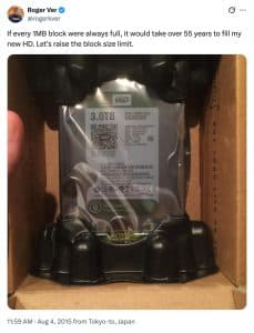 As guerras de tamanho de bloco colocaram duas facções uma contra a outra. De um lado estavam os “grandes bloqueadores”, uma coalizão de mineradores e empresas, liderada por figuras como Roger Ver. Eles argumentavam que o tamanho original do bloco de 1 MB do Bitcoin era muito pequeno para lidar com o crescente número de transações, tornando-o inadequado para uso comercial e um afastamento da visão de Satoshi Nakamoto de um sistema de dinheiro eletrônico ponto a ponto.
