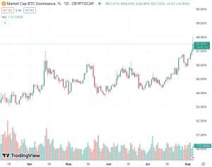 O domínio do Bitcoin — a proporção da capitalização de mercado do Bitcoin para todo o mercado de criptomoedas — atingiu uma nova alta anual de 58% em meio a uma queda do mercado de criptomoedas e ações.