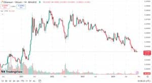 O Ether (ETH) é historicamente um dos primeiros ativos a se mover quando o domínio do Bitcoin diminui, mas a proporção de Ether para Bitcoin, uma taxa de conversão de BTC para ETH, está perto de seu nível mais baixo desde abril de 2021.