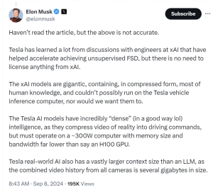 “A Tesla aprendeu muito com as discussões com engenheiros da xAI que ajudaram a acelerar a obtenção de FSD não supervisionado, mas não há necessidade de licenciar nada da xAI.”
