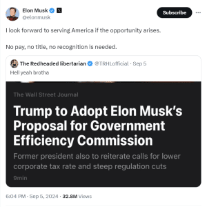 O ex-presidente dos Estados Unidos, Donald Trump, disse recentemente que criaria uma comissão de eficiência governamental, com Musk como chefe da nova instituição governamental, se Trump reivindicasse o Salão Oval novamente na eleição de novembro de 2024.