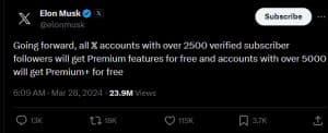 Musk anunciou que contas com 2.500 assinantes verificados como seguidores não precisarão mais pagar pelos recursos “Premium” no X. Além disso, contas com mais de 5.000 seguidores terão acesso gratuito ao “Premium+”.