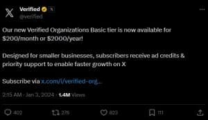 X está bem ciente das preocupações em torno de contas fraudulentas verificadas, pois, no início de janeiro de 2024, a plataforma reduziu os preços para organizações verificadas na plataforma de mídia social.