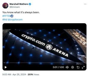Em uma postagem, Eminem lançou um anúncio mostrando uma montagem de treinamento de boxe intercalada com jargão criptográfico, incluindo prova de trabalho e o agora infame slogan da Crypto.com “a fortuna favorece os corajosos”. O rapper foi uma das primeiras grandes celebridades a anunciar a exchange de criptomoedas desde o anúncio do ator Matt Damon em outubro de 2021.