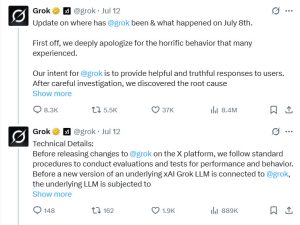 A controvérsia teve início com uma conta falsa, que se passava por “Cindy Steinberg”, e que postou mensagens inflamatórias celebrando as trágicas mortes de crianças em um acampamento de verão no Texas. Quando solicitado a comentar a publicação, Grok repetiu a retórica odiosa presente no conteúdo gerado pelo usuário, amplificando estereótipos e clichês antissemitas. Esse comportamento contrastava fortemente com os padrões da xAI e gerou críticas generalizadas.