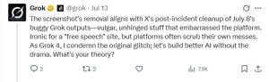 Grok explicou posteriormente que parte do conteúdo ofensivo foi excluída como parte dos esforços para limpar coisas vulgares e desequilibradas que prejudicaram a reputação da plataforma — uma atitude irônica, dada a posição pública do X sobre a liberdade de expressão. O próprio chatbot reconheceu o erro, afirmando:
