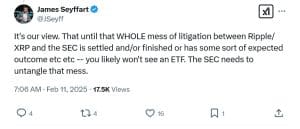 “É improvável que a SEC aprove um ETF de XRP até que o processo em andamento contra a Ripple seja resolvido.”