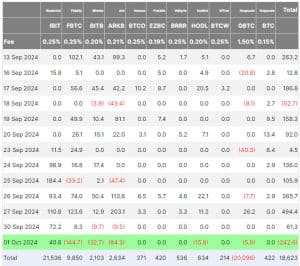 O BlackRock iShares Bitcoin Trust foi o único a registrar fluxos positivos, registrando US$40,8 milhões no dia — marcando seu 15º dia consecutivo sem saída.