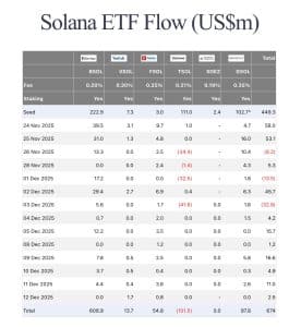 Os dados recentes da FARSIDE INVESTORS mostram que o ecossistema de ETFs do Solana atraiu mais de US$ 674 milhões em entradas líquidas acumuladas desde sua estreia histórica. Essa sequência atingiu seu pico na terça-feira, 16 de dezembro, com aproximadamente US$ 16,6 milhões em capital novo entrando no mercado.